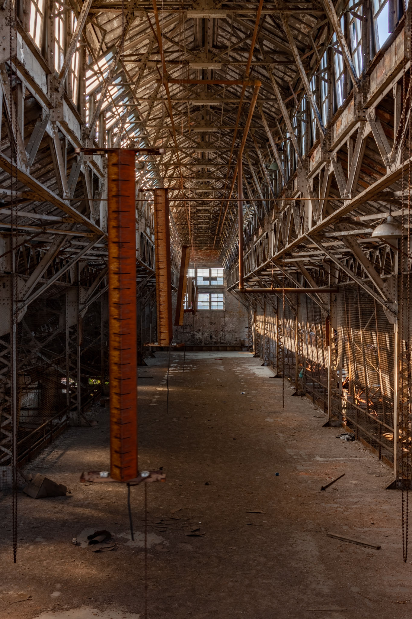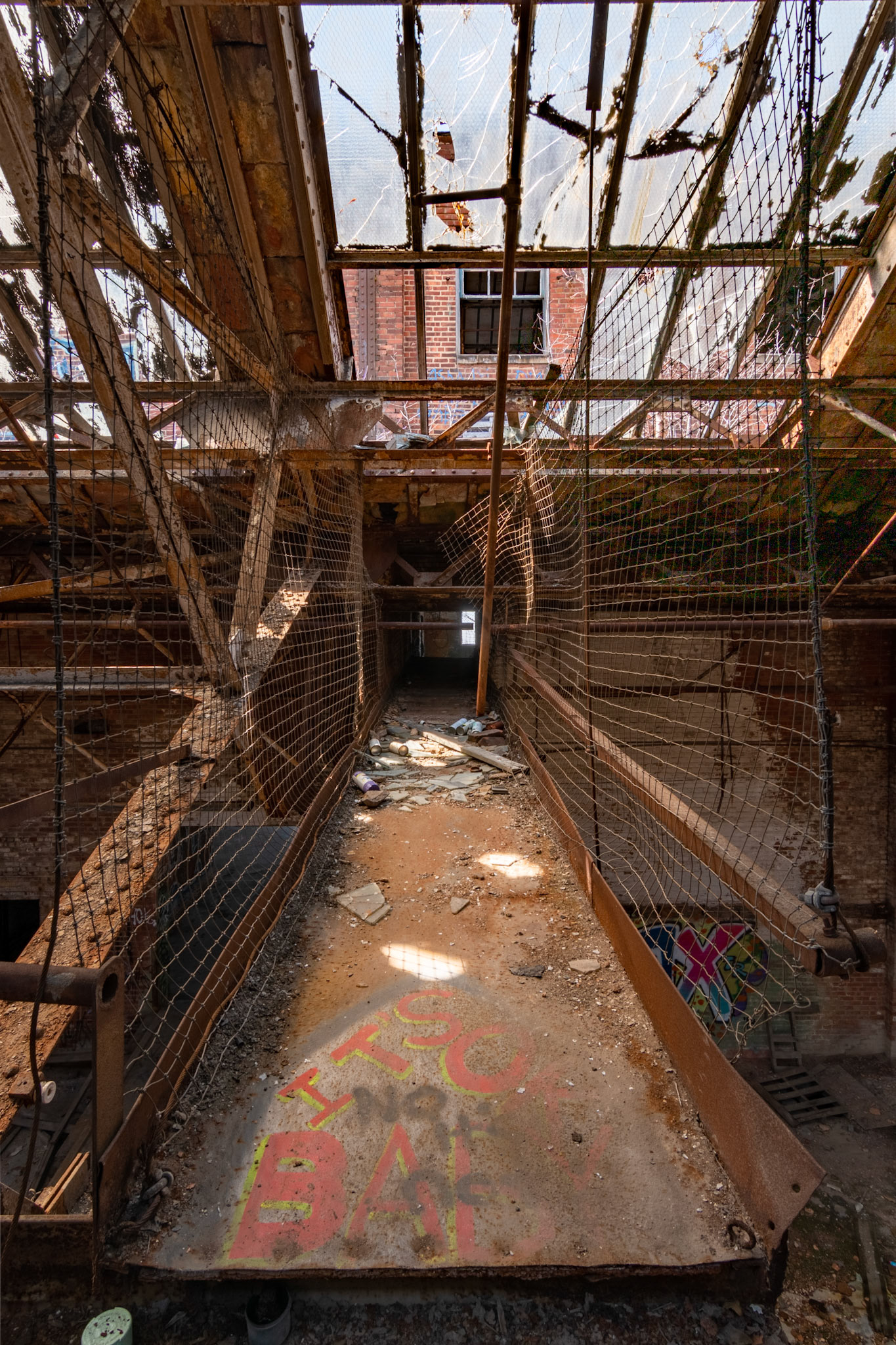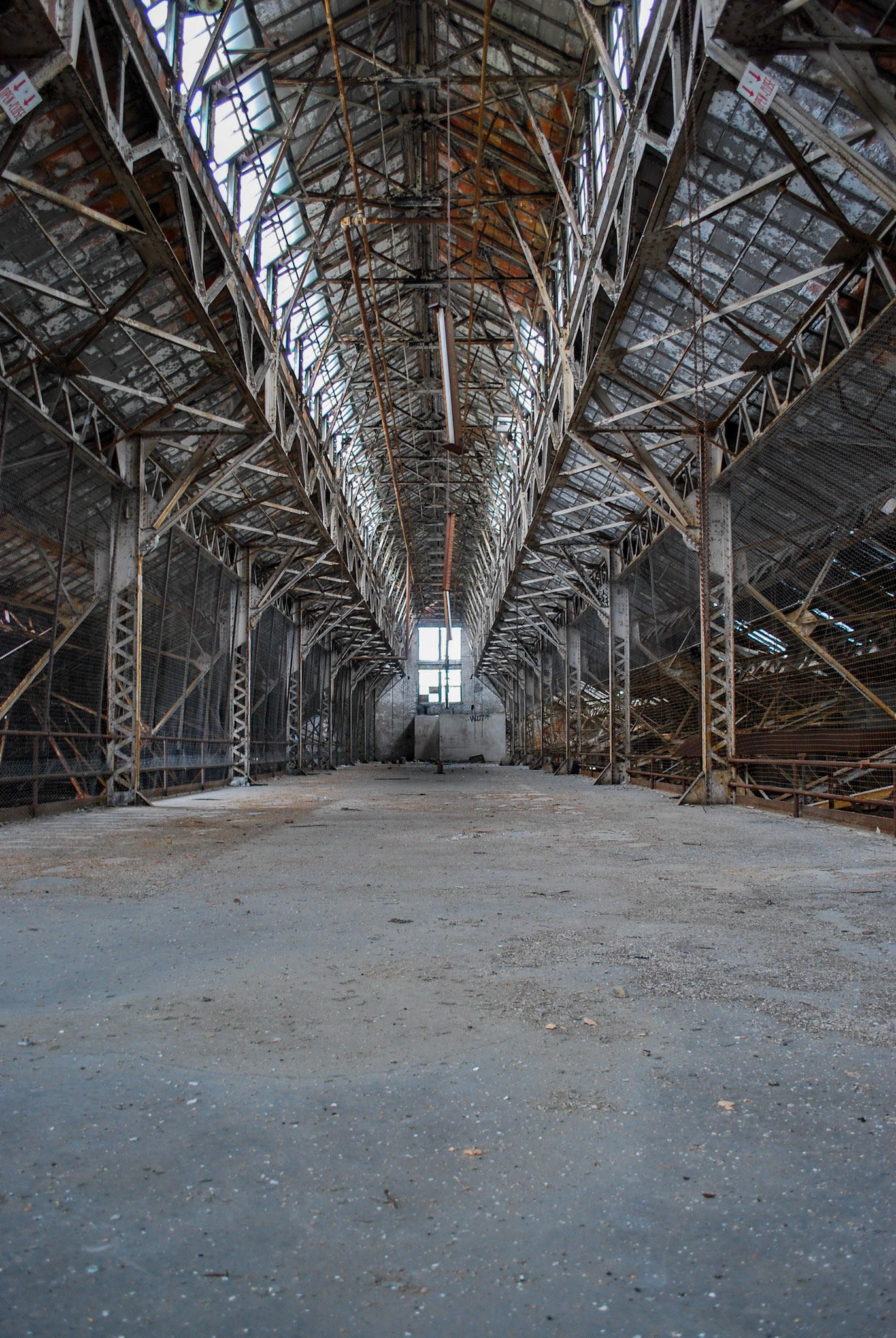 During filming, the building was obviously cut off from visitors. I remember seeing rows of trailers on the street during filming. Lots of cleanup was done in and around the building likely as a safety precaution. Some large equipment and debris were moved and the floors were swept clean. Wooden bannisters were built along the stairwells.