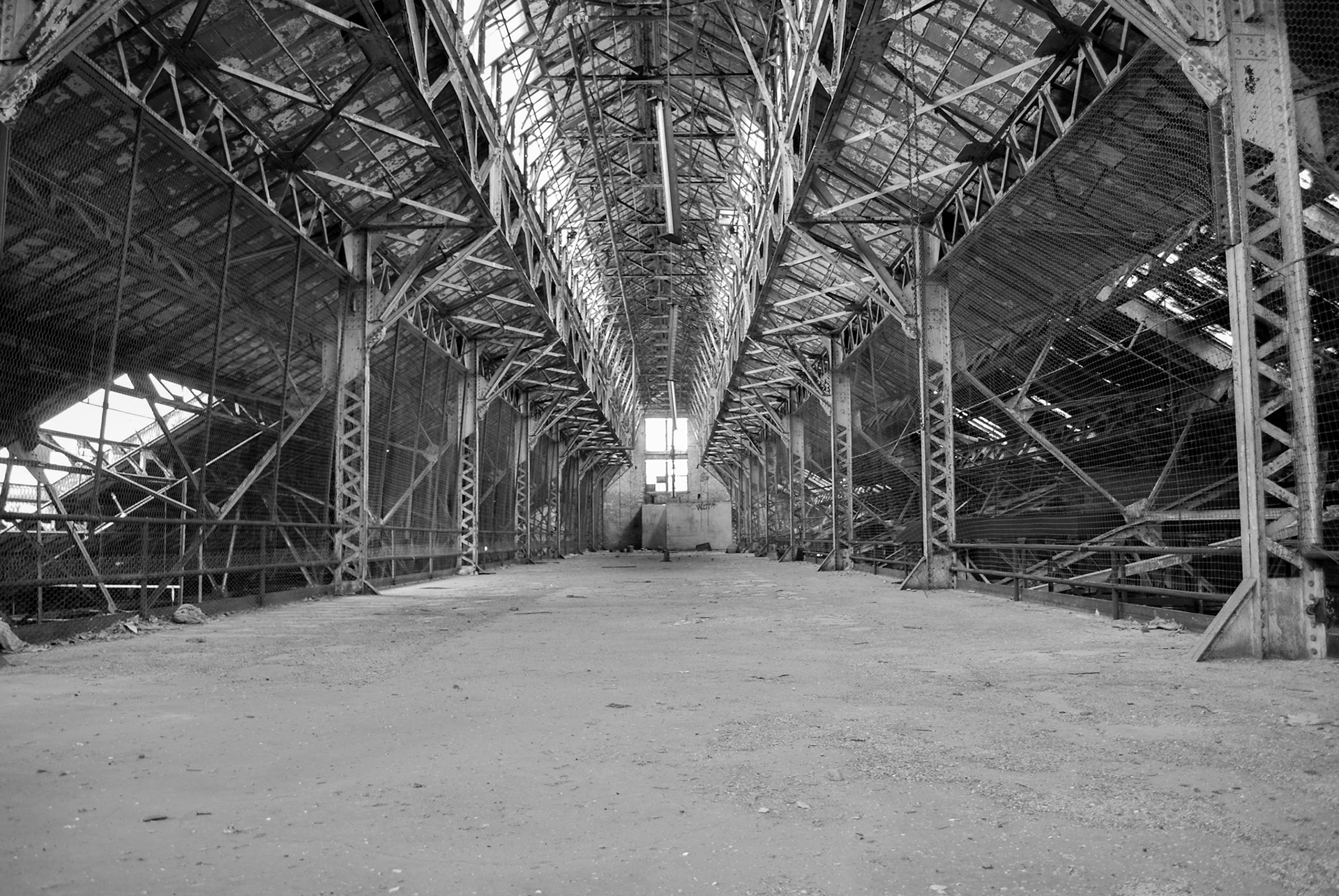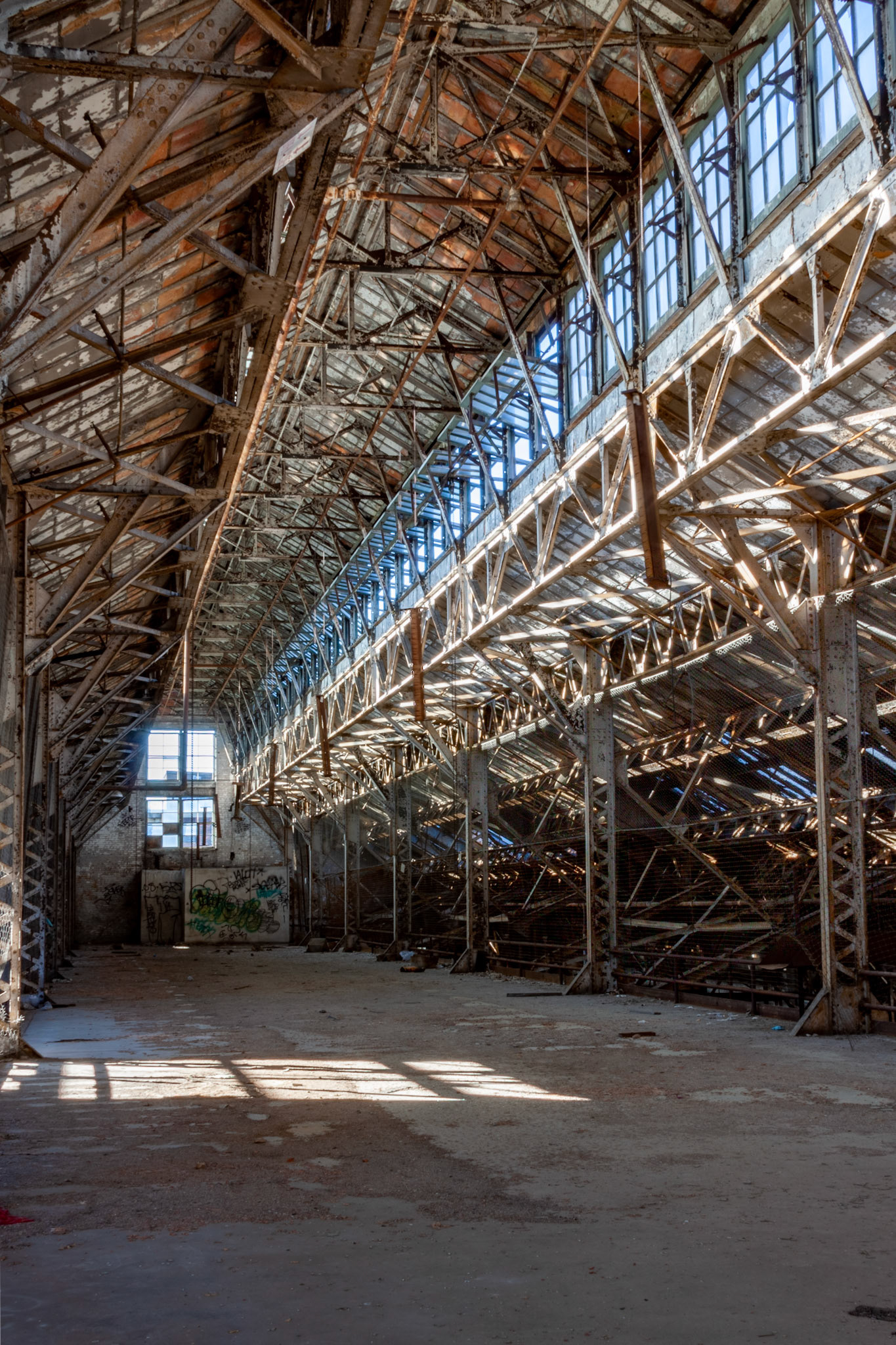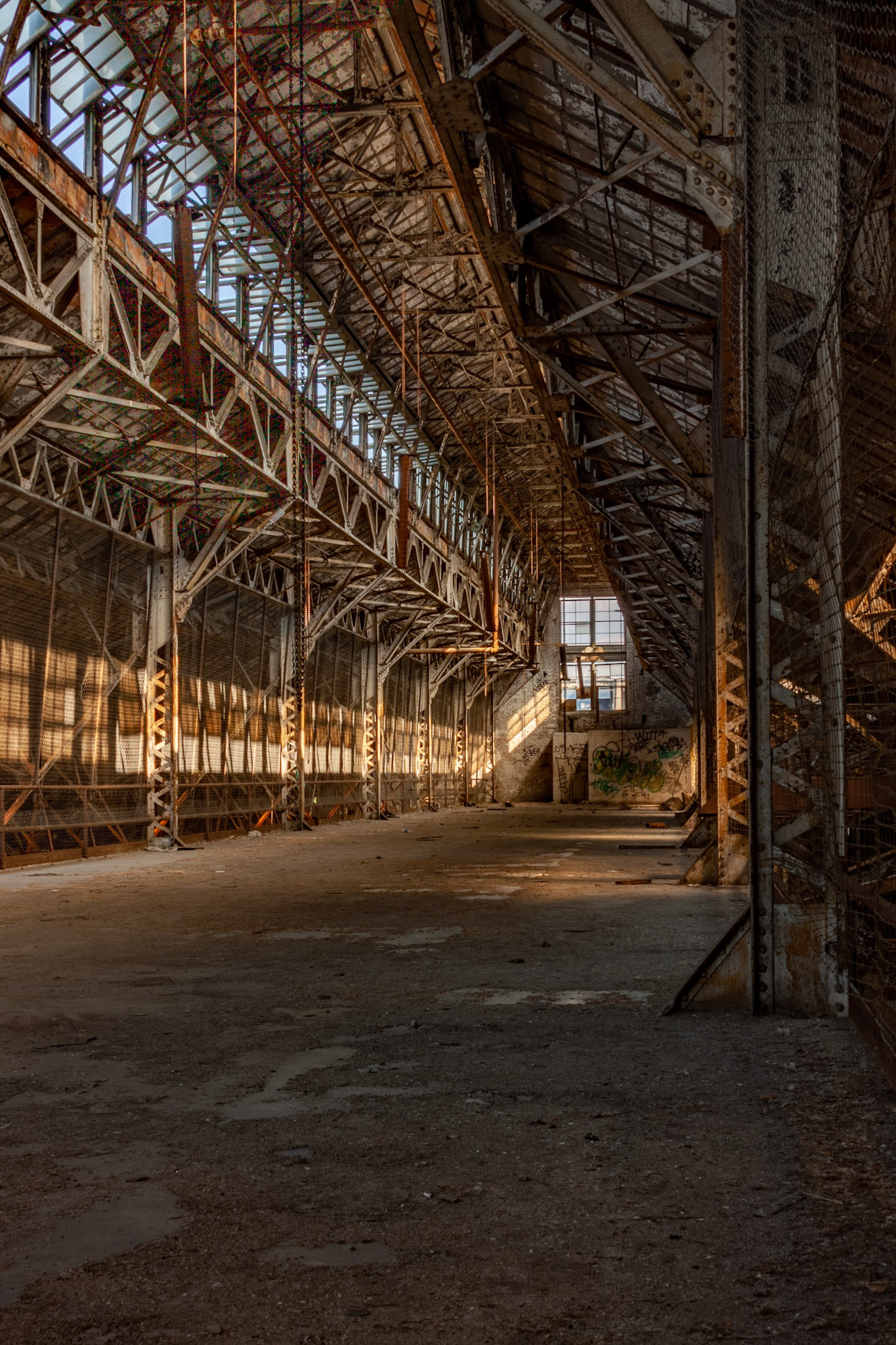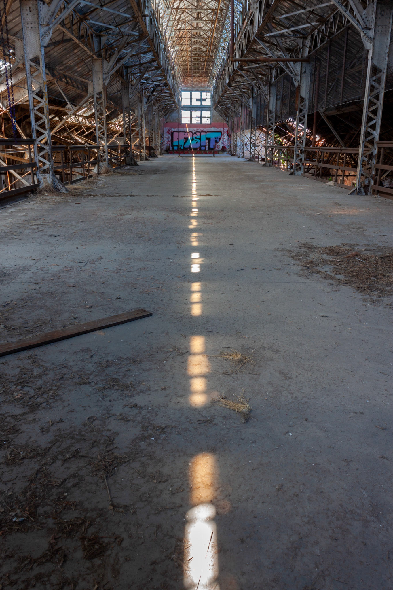 During filming, the building was obviously cut off from visitors. I remember seeing rows of trailers on the street during filming. Lots of cleanup was done in and around the building likely as a safety precaution. Some large equipment and debris were moved and the floors were swept clean. Wooden bannisters were built along the stairwells.